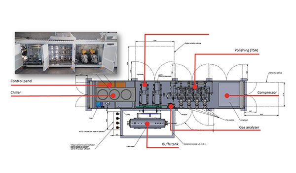 CO2-Rückgewinnung leicht gemacht: Unsere hochmodernen Anlagen zur CO2-Rückgewinnung bieten eine äußerst effiziente Methode, um das aus der Biogasaufbereitung gewonnene CO2 in reinsten Rohstoff (99,998 %) zu verwandeln. Diese Anlagen werden nach höchsten Qualitätsstandards in Containerbauweise in unserer Produktionsstätte in Turin gefertigt und direkt beim Kunden installiert.