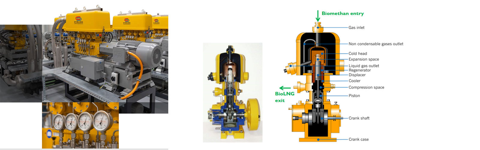 Damit Biomethan als Kraftstoff eingesetzt werden kann, muss das Biomethan zu BioLNG umgewandelt werden. Dazu wird das aufbereitete Biogas aus der Gasaufbereitung durch eine Feinreinigung geführt und anschließend im Stirling-Kryokühler auf eine Temperatur von -155 °C gekühlt. Bei dieser Temperatur wird das Biomethan verflüssigt und kann als Kraftstoff eingesetzt werden. Das sich daraus ergebende BioLNG wird in kryogenen Lagertanks gelagert oder direkt an einer Tankstelle vertankt.