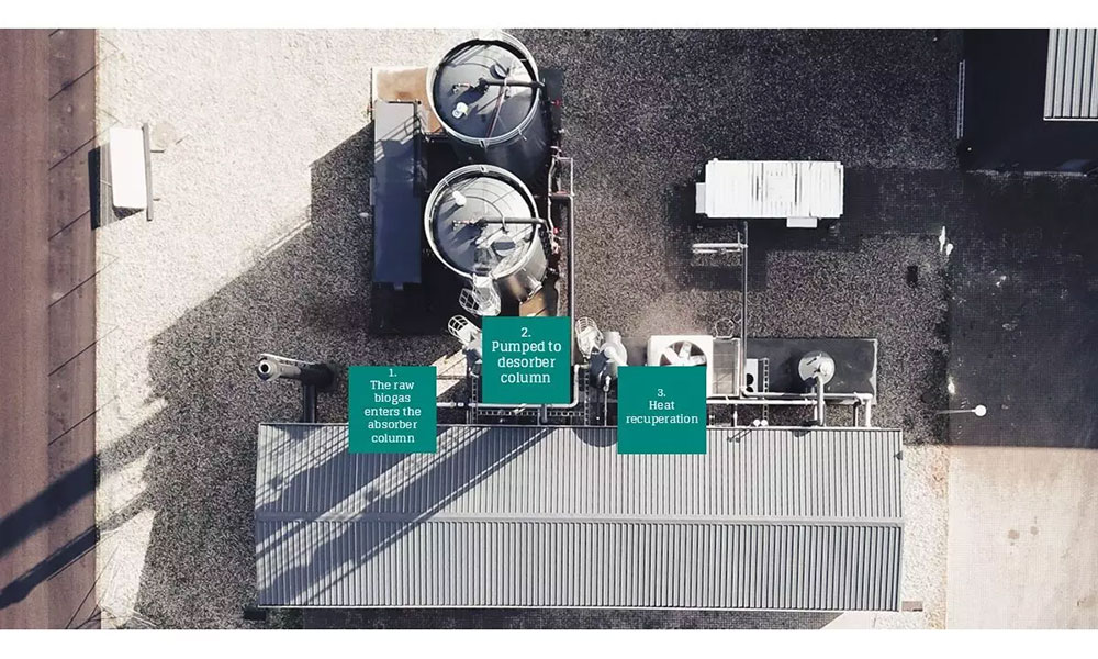 By separating and removing the CO₂, raw biogas is efficiently upgraded to high-purity biomethane. Our advanced absorption process is exceptionally efficient, with the ability to limit methane slip below 0.05% – resulting in a methane recovery rate exceeding 99.95%.