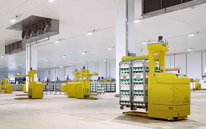 Gerolsteiner has been using driverless transport systems from ek robotics since 2013. Five CUSTOM MOVE transport robots with robust weather protection cladding are used for the area link between production and warehouse in the outdoor area.