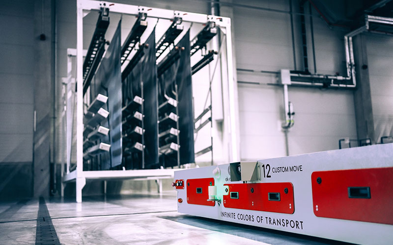 As here in the awning production - the up to 6 m long racks with customised awnings and their raw materials are safely transported by our HEAVY MOVE to the production lines and dispatch on schedule.