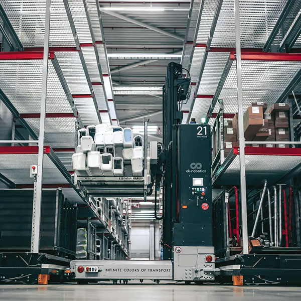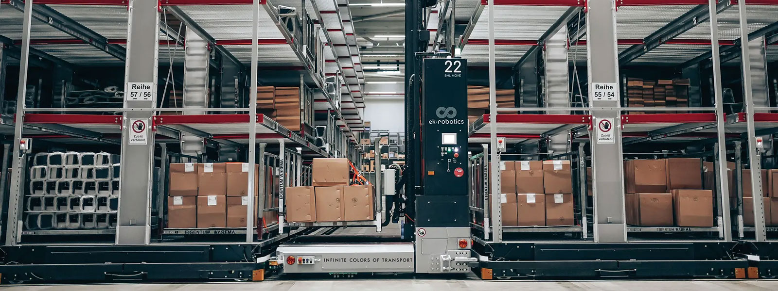 ek robotics also offers suitable fully automatic solutions for use in a mobile racking system, e.g. for storing packaging materials with a lower load turnover. In this way, an optimal space utilisation ratio is achieved.