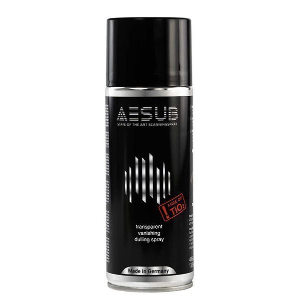 • AESUB transparent is a scan spray that temporarily mattes glossy surfaces with a transparent film. This allows optical scanners to capture not only the surface contours but also the color values of the measured object at the same time. AESUB transparent is vanishing so no cleaning required.