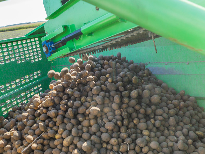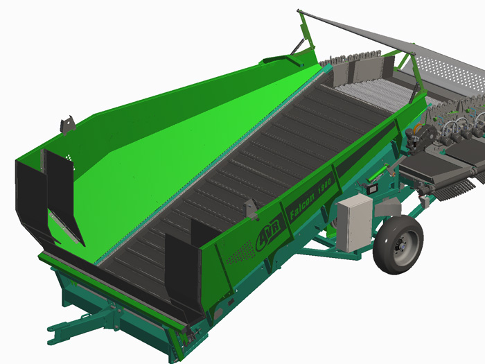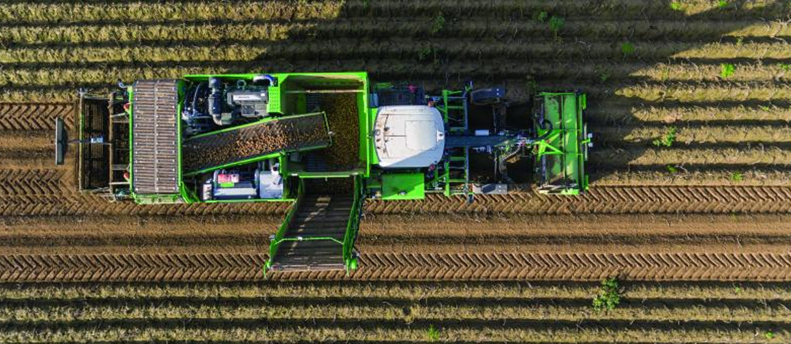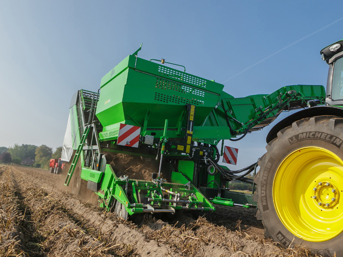 This compact 2-row Spirit 6200 offset bunker harvester is highly reliable because of its simple design, and performs spectacularly at the same time. The sophisticated soil separation immediately commences on the digging and sieving web. Subsequently, the efficient haulm web separates the haulm from the tubers, and an in-line pintlebelt removes any remaining loose soil and haulm from the product flow.