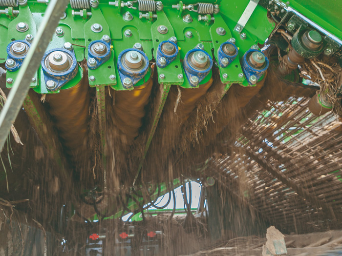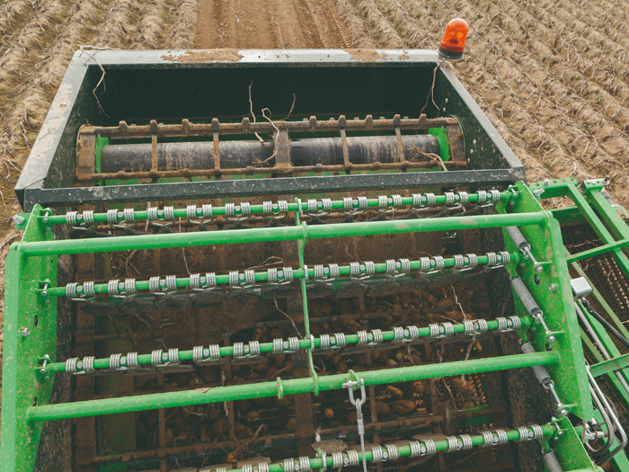 A cross roller set can be mounted before the pintlebelts. This leads to a significant increase in the machine’s cleaning capacity, without the need for additional direction changes to the potato flow. This is a unique concept! The cross rollers efficiently remove loose soil, small clods of earth and smaller stones from the product flow. Because of this, the pintlebelts can easily remove the remaining loose soil and haulm.
