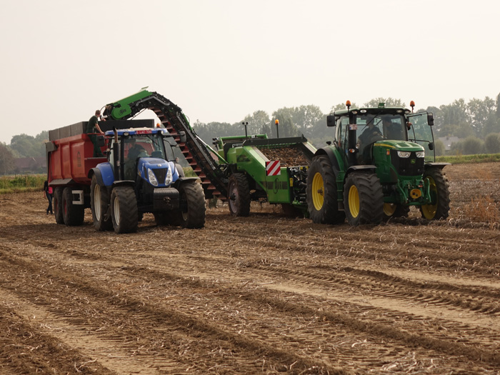The driver can easily keep an eye on the harvesting process as it is an offset harvester. Offset harvesting means that the tractor does not need to be equipped with row crop tyres. The tractor can continue to run on wide tread tyres. This is a great advantage when harvesting in difficult conditions, and it also helps to protect the soil! The tractor wheels do not form any clods or compact the soil during the harvesting process.