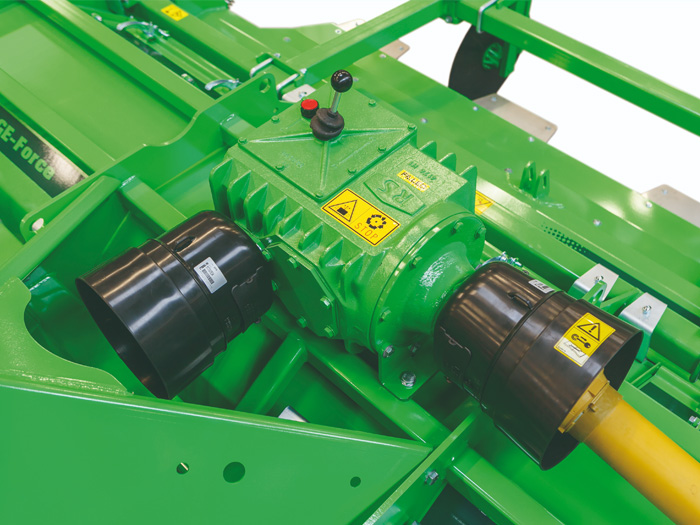 The GE-Force is equipped with a simple one speed gearbox that directly transmits the incoming torque to the side drive. The standard gearbox can handle up to 250 hp of power. A 380 hp gearbox is also available as an optional extra; in addition a 3 speed gearbox is also available which offers greater flexibility with the rotor speeds for use in varied soil types. Since the rpm is only reduced in side drive, the forces that act on the intermediate shafts and bearings are limited, leading to far less component wear and tear.