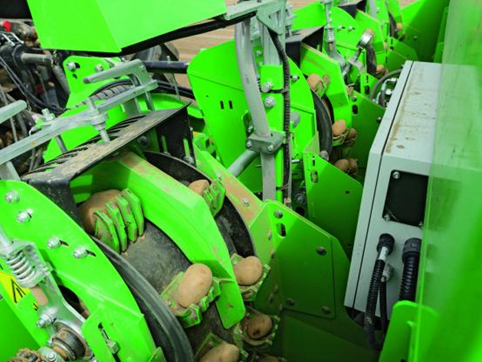 The planting element is a model of precision and reliability. Two times 20 cups mounted on the cup belt ensure a continuous precision at high planting speeds. Also at higher driving speeds, the planter operates relatively calmly. The large upper drum ensures stillness at the top side, the small top roller at the bottom side, and the slightly tilted position of the planting element guarantees an accurate placement (also on inclines).