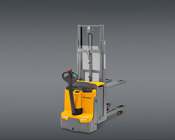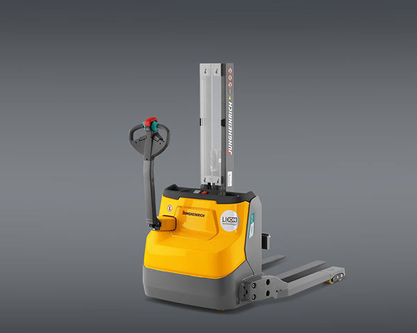The EJC 010i is the entry-level model in the pedestrian-controlled electric stacker truck segment. It is ideal for environments or warehouse areas with limited space and can handle transport and lifting tasks up to 1,000 kg as well as stacking tasks up to 3.60 m. The versatile all-rounder has a duplex telescopic mast with five different lift heights from 2.30 to 3.60 m. Its battery capacity of 50 Ah including built-in charger (15 A) ensures a high degree of availability. Thanks to its compact dimensions and small turning circle, the EJC 010i always cuts a fine figure, even in the tightest of spaces. As an ergonomic lift platform, it is ideal for equipping machines. Its low overall height allows an excellent view of the forks and environment. In short: the EJC 010i is the ideal solution for small to medium-sized companies that occasionally need to transport lightweight goods over short distances and store them.
