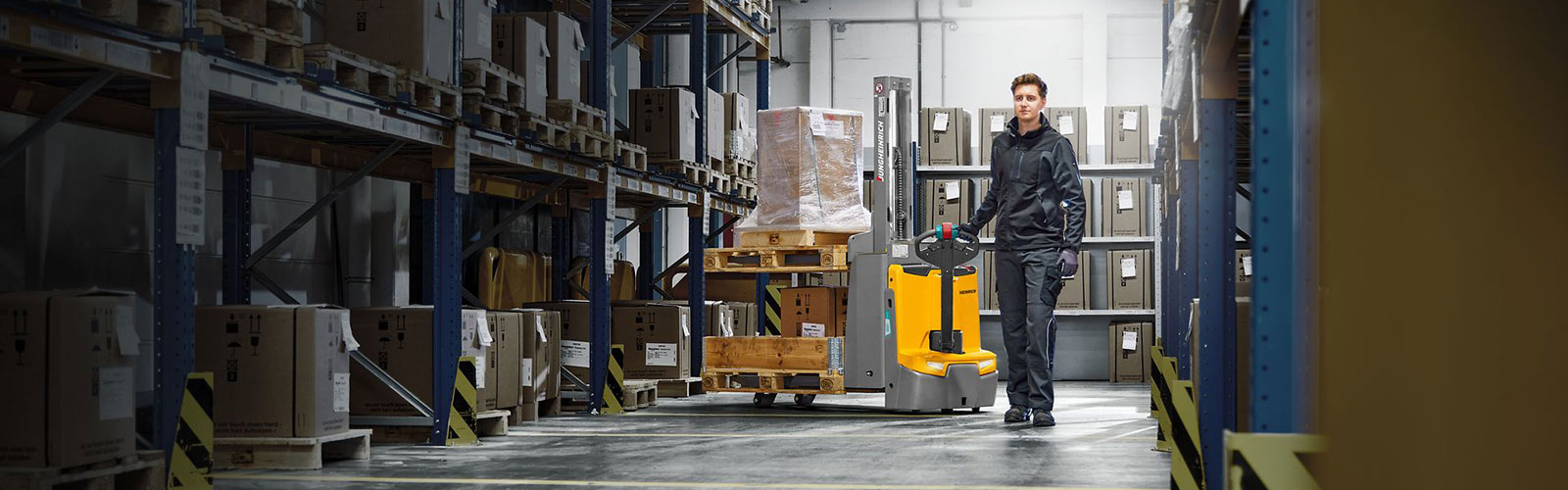 Our electric high-lift pallet trucks with forks are used wherever goods are stored and relocated and wherever picking is done with a lifting height of up to 4,700 mm . In all vehicles, the tipping point lies on the drawbar, which is why high-lift trucks are also referred to as pedestrian stackers. Due to the hydraulic lift, the devices are also known as hydraulic pallet stackers.