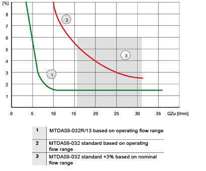 Bucher Hydraulics is regarded as the world‘s leading manufacturer in the field of hydraulic flow divider. The newest addition to the product portfolio is a flow-dividing valve with greatly increased division accuracy as well as an extended working range. With this new valve, division accuracy is specified in relation to the supply flow rate and not, as is usual in the market, to the nominal flow rate (see chart).