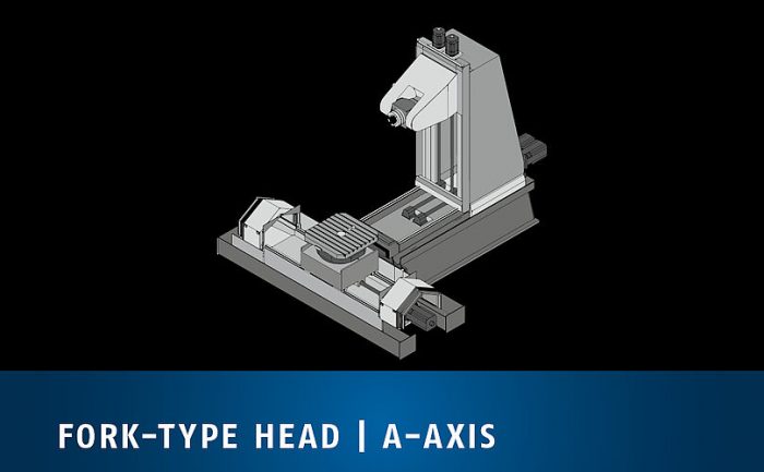 The A-axis is thus designed as a full NC-axis. Two versions are available, one as motor spindle with 12,000 min-1 / 300 Nm torque and the other as motor spindle with 6,000 min-1 / 900 Nm torque. The fork head further provides a spindle clamping for the adaption of turning tools for milling and turning machining centres.
