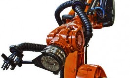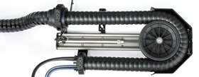 The „Triflex R“ multi- dimensional moving energy chain is used for power, data and media supply. This energy chain construction kit, specifically for robot users, has approximately 250 components to guide cables and hoses securely around difficult geometries. These „robot chains“ are available in three designs: First, a closed design for cable protection in harsh applications such as those involving spatter welding machines, chips and dirt. Second, an „Easy“ version, where the cables are quickly pushed into the chain by hand, at any time. And third, an easily managed and especially rapidly assembled „Light“ version. The „Triflex R“ 3D energy chain series, which has been used worldwide for years and is available from stock, ensures a predetermined minimum bend radius and torsional stop for careful cable guiding. The tensile strengths are absorbed by the energy chain, which significantly increases the life of the cables and so avoids downtime.