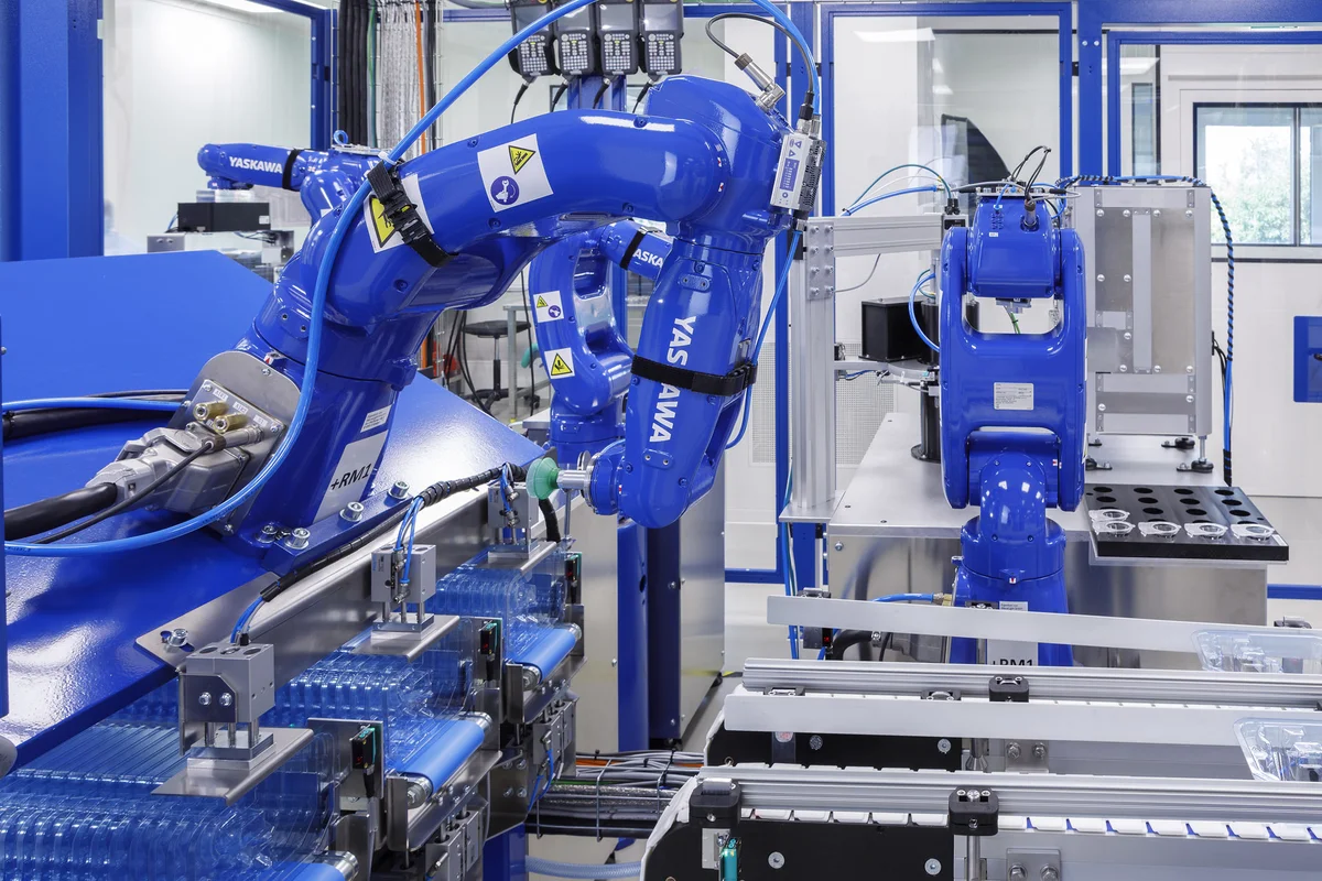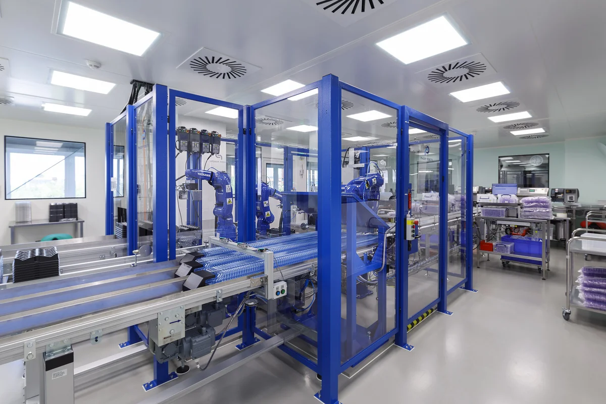 The automation of these diverse handling processes made several aspects more difficult. Because they come from different sources, the plastic cones to be tested are present in different geometries. The delivery trays also vary in shape and layout, requiring flexible handling. Additionally, the entire process takes place in an environmentally controlled room. Compliance with strict hygiene standards prevents contamination of the products, and the components are then sterilized along with the blister packaging.