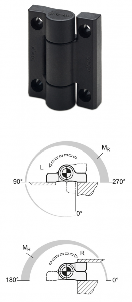 Ganter, the Black Forest specialist for standard parts, offers numerous designs for the new functional hinge as usual: The hinge can be easily configured and ordered to meet individual needs, be they left or right return, high or low spring restoring torque, or for supplemental hinges without a return spring. In line with normal policy, Ganter maintains a specific solution for every use.