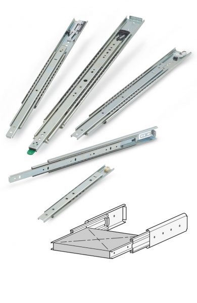 Depending on the length of the extension (between 300 and 1,500 mm), the telescopic slides are made up of two, three or four interconnected slides. These slides are guided by ball bearings, which are securely embedded by ball cages.
