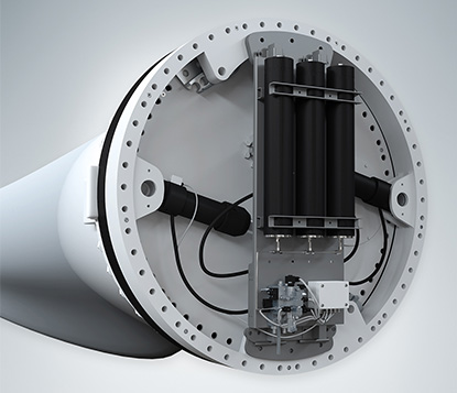 The pitch module consists of the pitch cylinders for turning the blade, hydraulic piston accumulators for demand-oriented power supply, the manifold with a highly dynamic proportional valve and the necessary piping. The pitch module can be used for both electrical and hydraulic pitch systems.