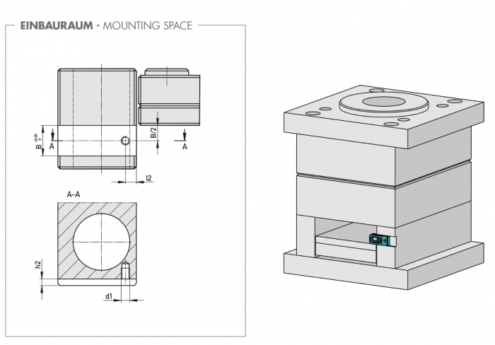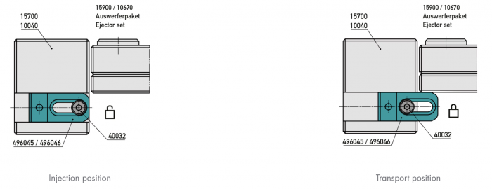 The simple and space-saving mounting of the transport lock is carried out via the risers of the mould base. Depending on the installation height of the ejector set, a recess is made at the appropriate position. The locking device can then be adjusted to suit the situation (injection position vs. transport position) using a slotted hole and fixed in place with a screw. The recess on the part itself makes it easier to adjust with your fingers. Alternatively, the hole can be used to move the lock using an Allen key.