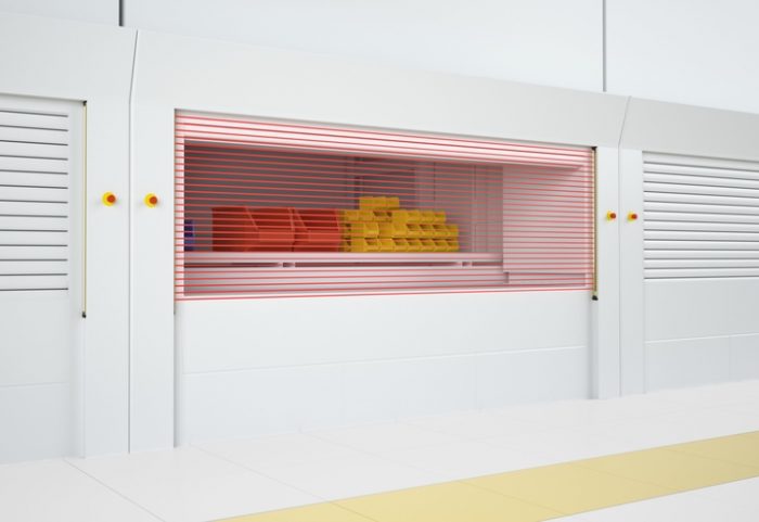 Multiple-beam safety light barriers as a protection guard on an industrial storage unit.