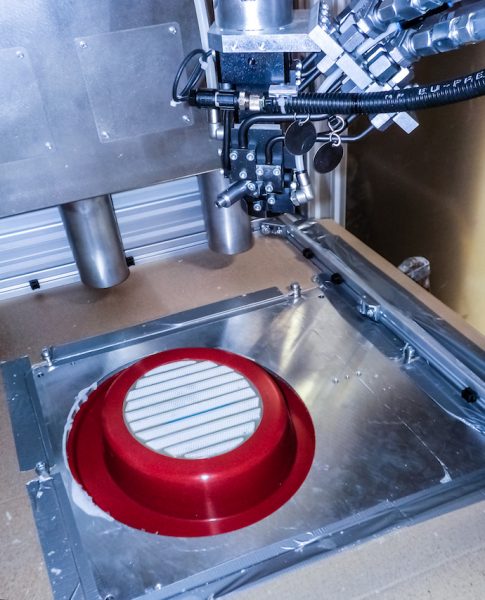 Nanostone contacted Hennecke in mid-2016 with an unusual request. The front of a ceramic industrial filter was to be sealed with polyurethane or polyurea. The challenge of this project was to avoid closing up the many nano-coated channels and to only wet the unprotected web structure between them, so that they may longer withstand the abrasive or chemical influences on the medium to be filtered and thus effectively increase the filter service life.