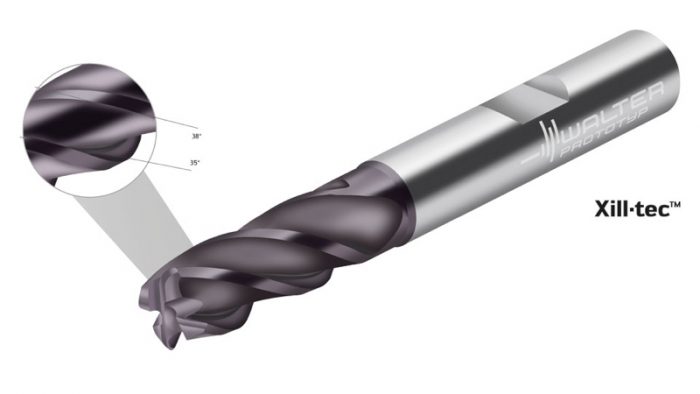 With Xill·tec™, the solid carbide milling cutters in the MC230 Advance product range, Walter is presenting a new range of products: A new type of high-performance geometry with an asymmetrical helix (35°/38°) was combined with Walter’s own wear-resistant and high-performance grade WK40TF. The result is a tool family with high performance that also offers universal applicability for roughing and finishing. The milling cutter experts have consolidated the developments of the past ten years in the Xill·tec™ range. The asymmetrical helix, the most important feature of the geometry, enables smooth, low-vibration operation: This is essential for long tool life and process reliability. Fractures are avoided and the high level of operational smoothness contributes to the soft cutting action of the Xill·tec™ milling cutter.