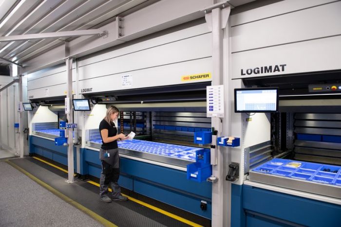 The ramp-up took place from April 2020. Prior to this, the old drawer cabinets were relocated to alternative areas and the new storage lifts were also filled during ongoing operations without any significant restrictions. In a first step, the SSI LOGIMAT® inventory is composed of two rows of three units each with the dimensions 3.8 x 3.1 x 7.3 m (LxWxH). They are each equipped with 58 trays (3,225 x 815 mm) and allow loads of up to 550 kg. Per lift, 64 tray changes per hour are possible. Around 15,000 LMB totes are used. LMB containers are special containers from SSI Schäfer that have been specially designed for use in warehouse lifts and optimised for the tray depth of 800 mm. The choice fell on four different container types of the LMB series, which can be varied within a tray and subdivided with stable partitions. This enables quick and easy allocation of the articles and prevents products from slipping through and being mixed up. The trays offer a direct overview of the parts to be removed and manual access is easily and ergonomically done from above – tedious bending and stretching in everyday work is no longer necessary. The additionally initiated batch picking enables WFL to process several orders in parallel, so that the picking performance has again increased noticeably.