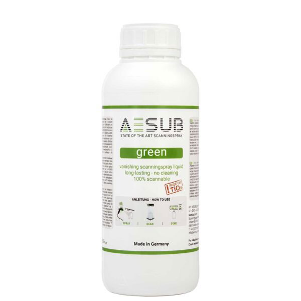 AESUB blue is a self-vanishing scanning spray developed by scanning experts. The spray evaporates within a few hours, meaning that there is no need for cleaning after scanning. Unlike traditional sprays, AESUB blue does not contain pigments and thus avoids pigment-contamination of sensitive areas, such as laboratories and production sites, equipment and users. You can therefore apply AESUB blue directly, on spot of scanning, without any costly transport to avoid said pigment-contamination in sensitive areas. Overall, AESUB blue greatly increases efficiency and productivity within the digitizing processes.