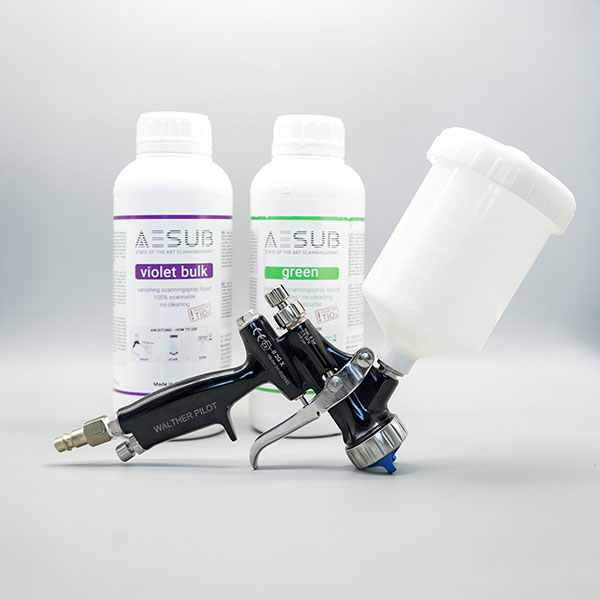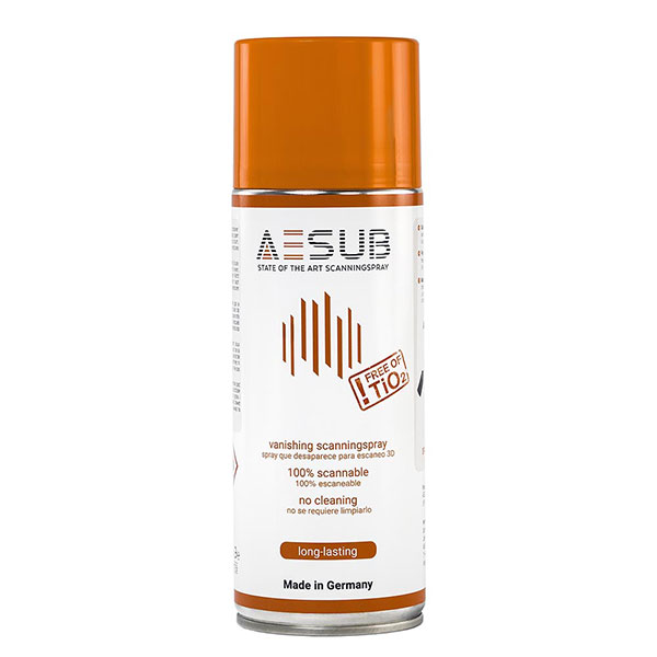AESUB transparent is a scan spray that temporarily mattes glossy surfaces with a transparent film. This allows optical scanners to capture not only the surface contours but also the color values of the measured object at the same time. AESUB transparent is vanishing so no cleaning required.
