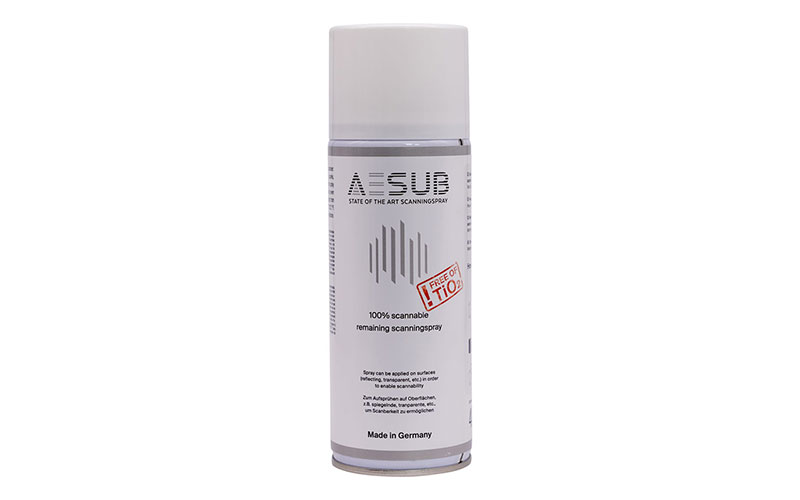 AESUB white is a permanent scanning spray developed by scanning experts. It is the result of consistent further development of permanent scanning sprays. The spray applies a homogeneous, thin matting layer onto the surface of the object. It is developed for optimal contrast values in optical scanning applications. AESUB white contains pigments, propellant and solvent and has been optimized with regards to material compatibility. AESUB white sets new standards by optimizing the surface’s homogeneity and reducing layer thickness. Unlike traditional sprays, AESUB white is free of titanium dioxide, associated with cancerogenic incidents through inhalation by the European Chemicals Agency.